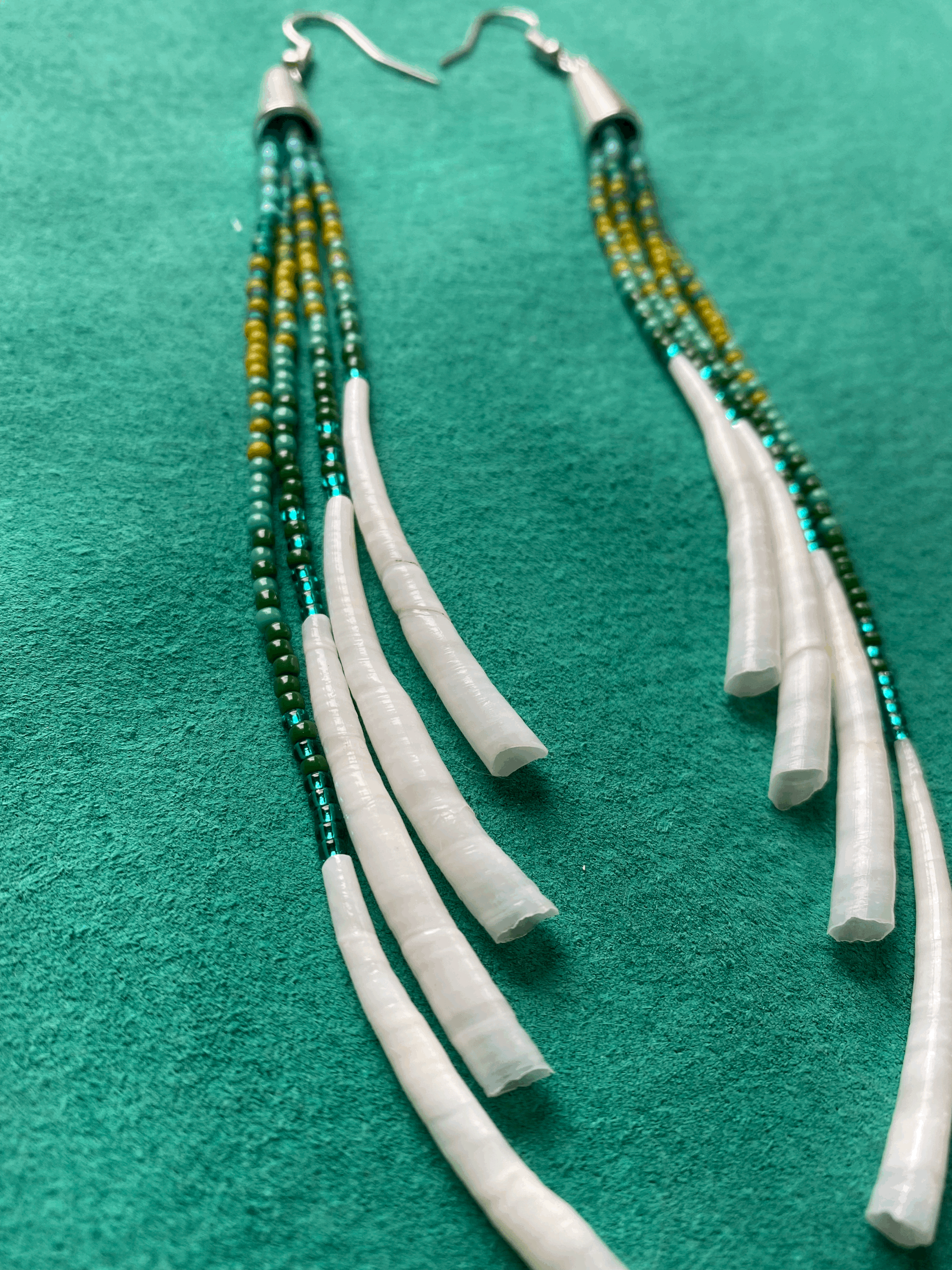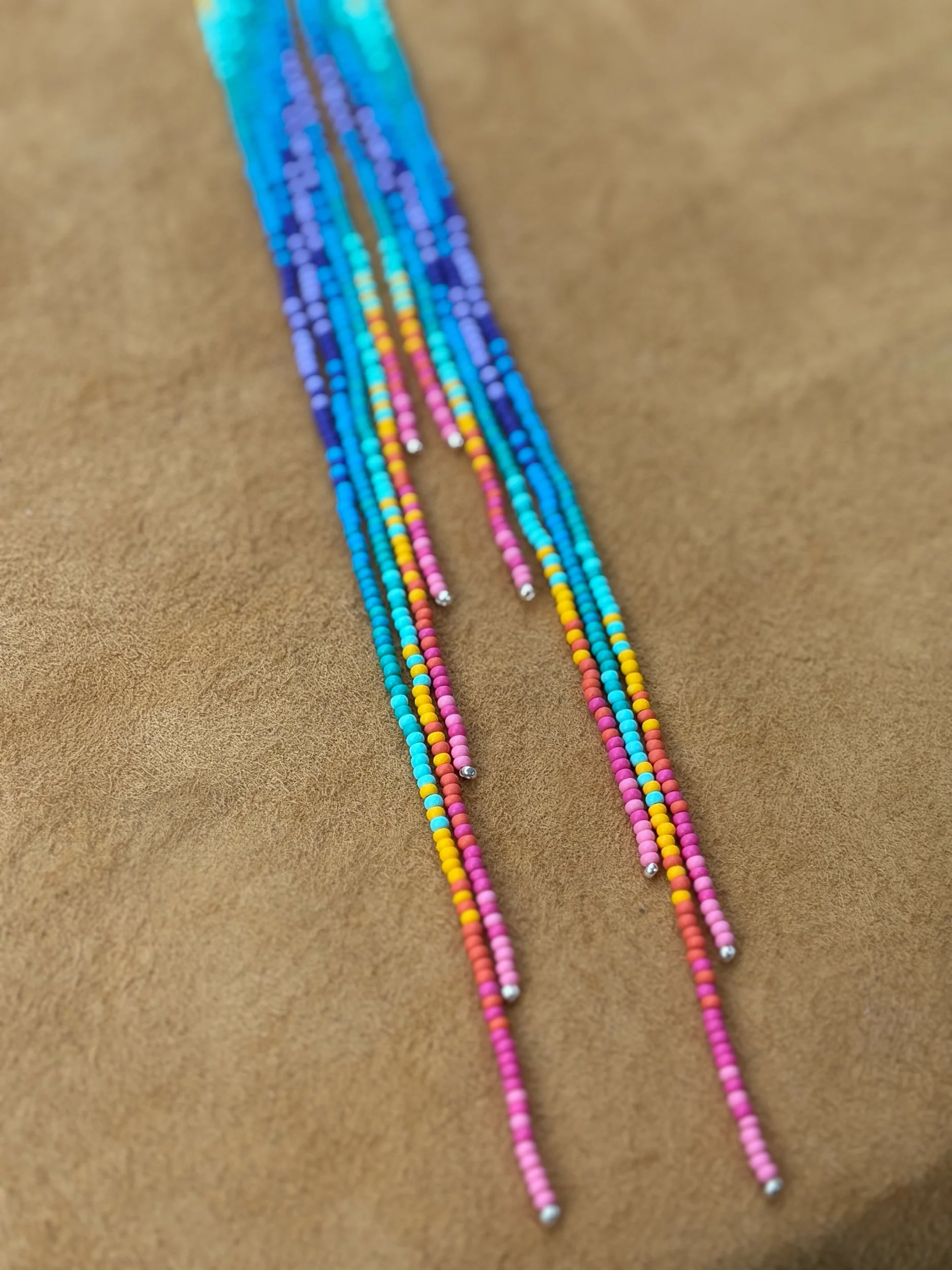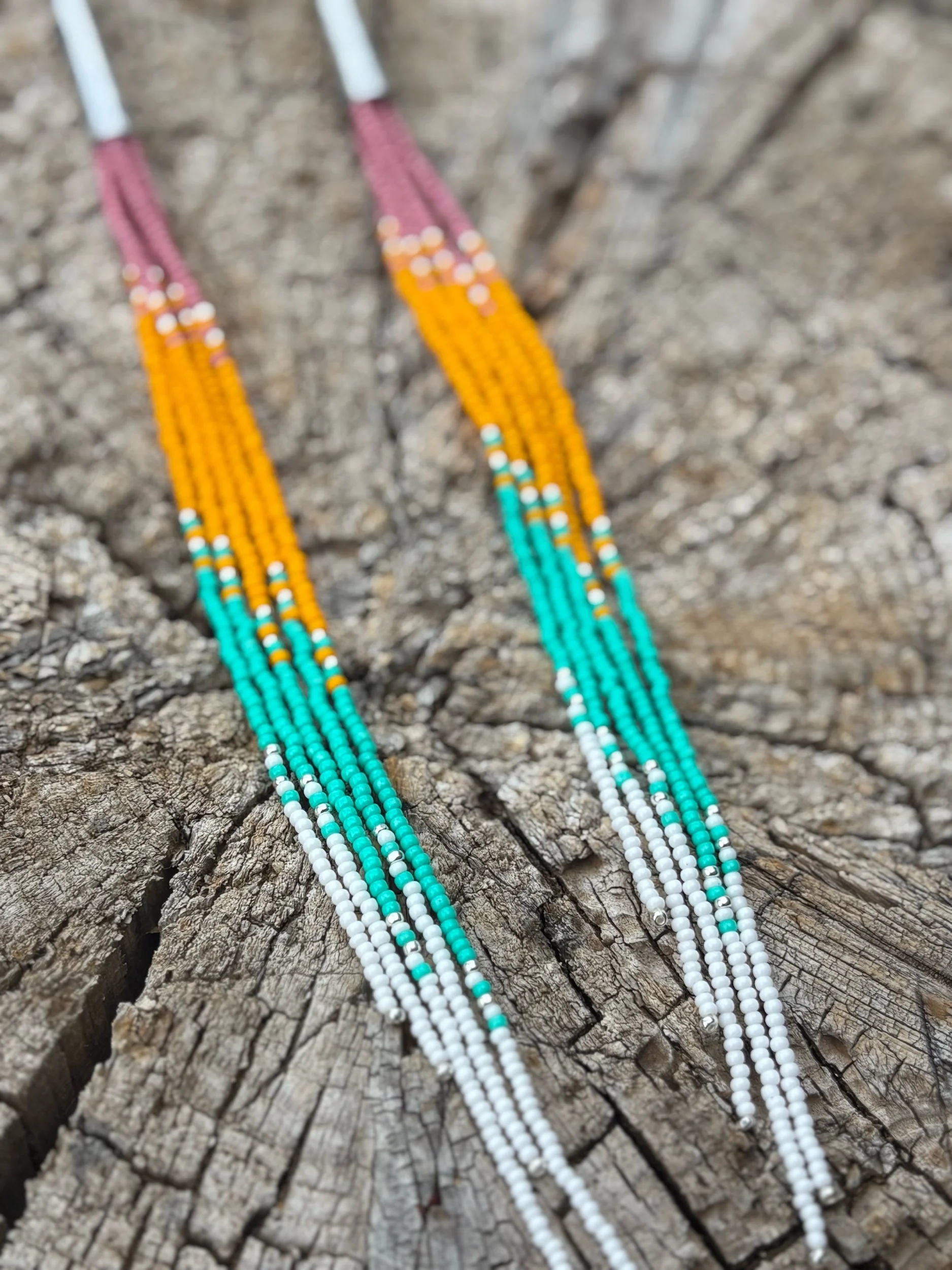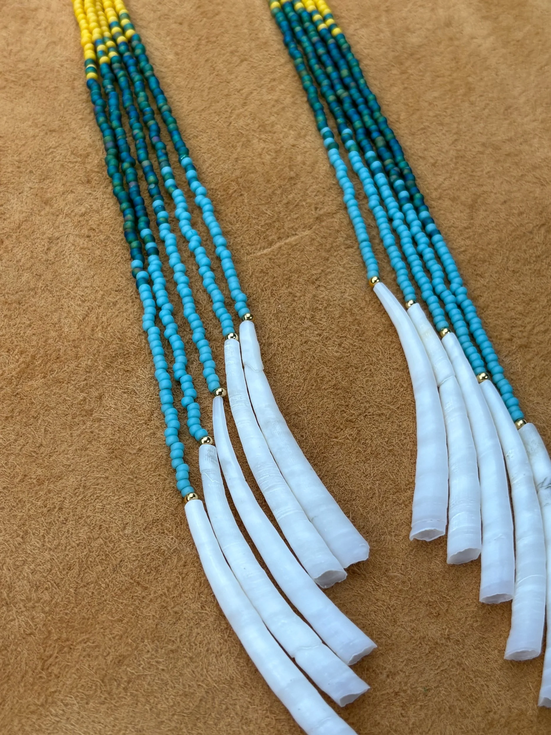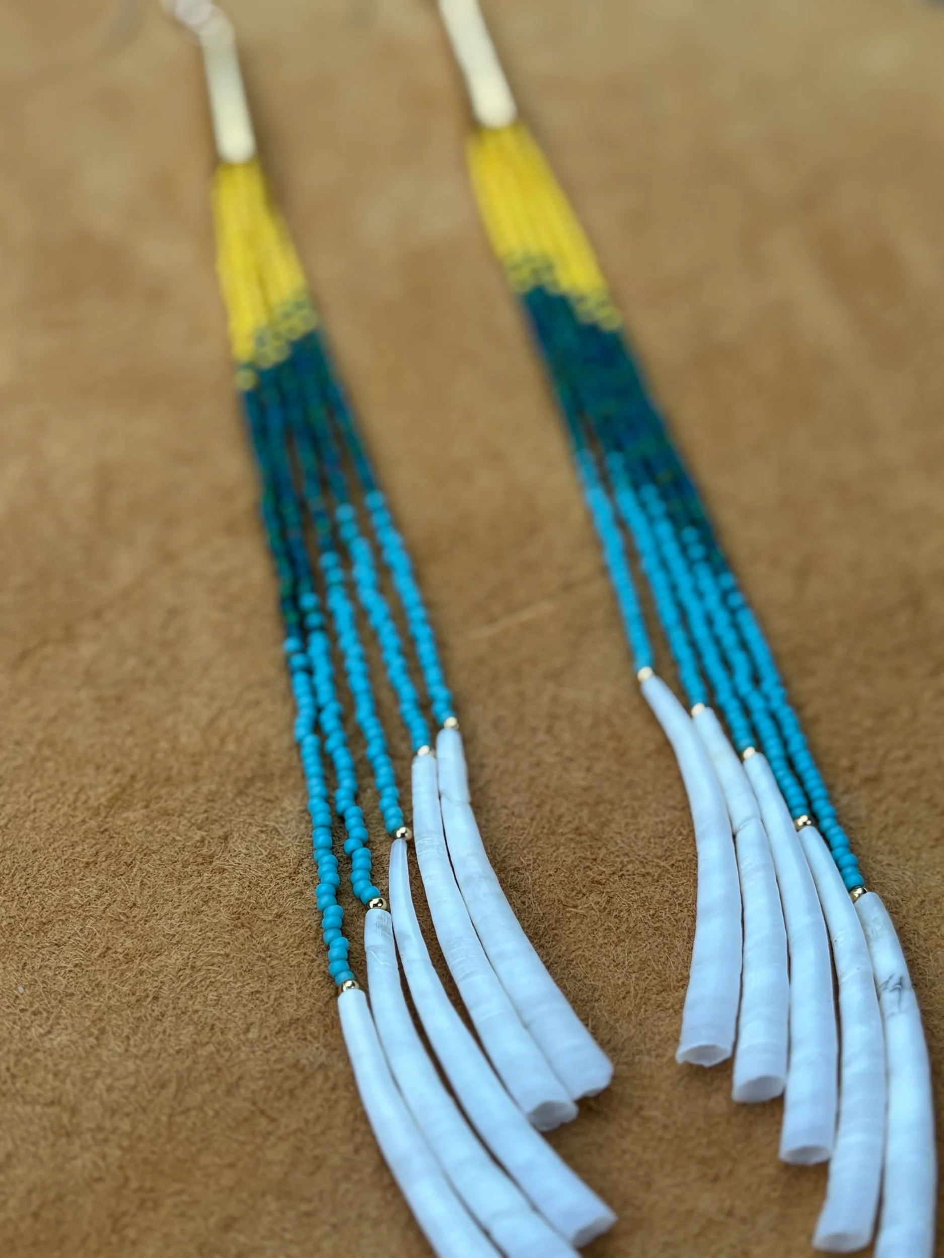 Turquoise and Sterling Silver Seven Strand Fringe Earrings $80.00 Orange and Blue “Thunder Theme Wristlet and Earring Set $70.00 Multicolored Striped Keychain $40.00 Four Strand Rainbow Matte Earrings $120.00 Matte Rainbow Cascading Fringe Earrings $120.00 Blue, Green and Yellow Five Strand Dentalium Fringe Earrings $120.00 Matte Chalk Block Fringe Earrings $80.00 Matte Mustard + Black Fringe Earrings $55.00 Matte Teal and Black + Sterling Silver Fringe Earrings $60.00 Matte Blue and Black + Sterling Silver Fringe Earrings $60.00 Multicolor Fringe Earrings with Sterling Silver Accents $60.00 Sold out Keychain $40.00 Hat Band Sale Price: $50.00 Original Price: $80.00 Sale Green and Gold Strawberry Fringe Earrings Sale Price: $45.00 Original Price: $60.00 Sale Green Dentalium Cascade Earrings $120.00 Sold out GIFT CARD from $50.00