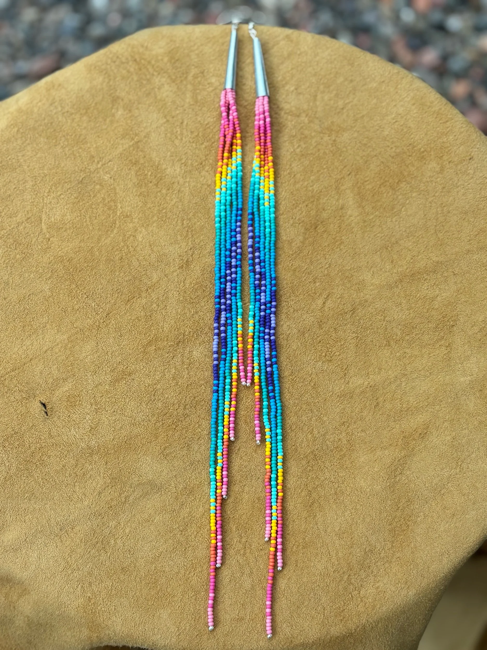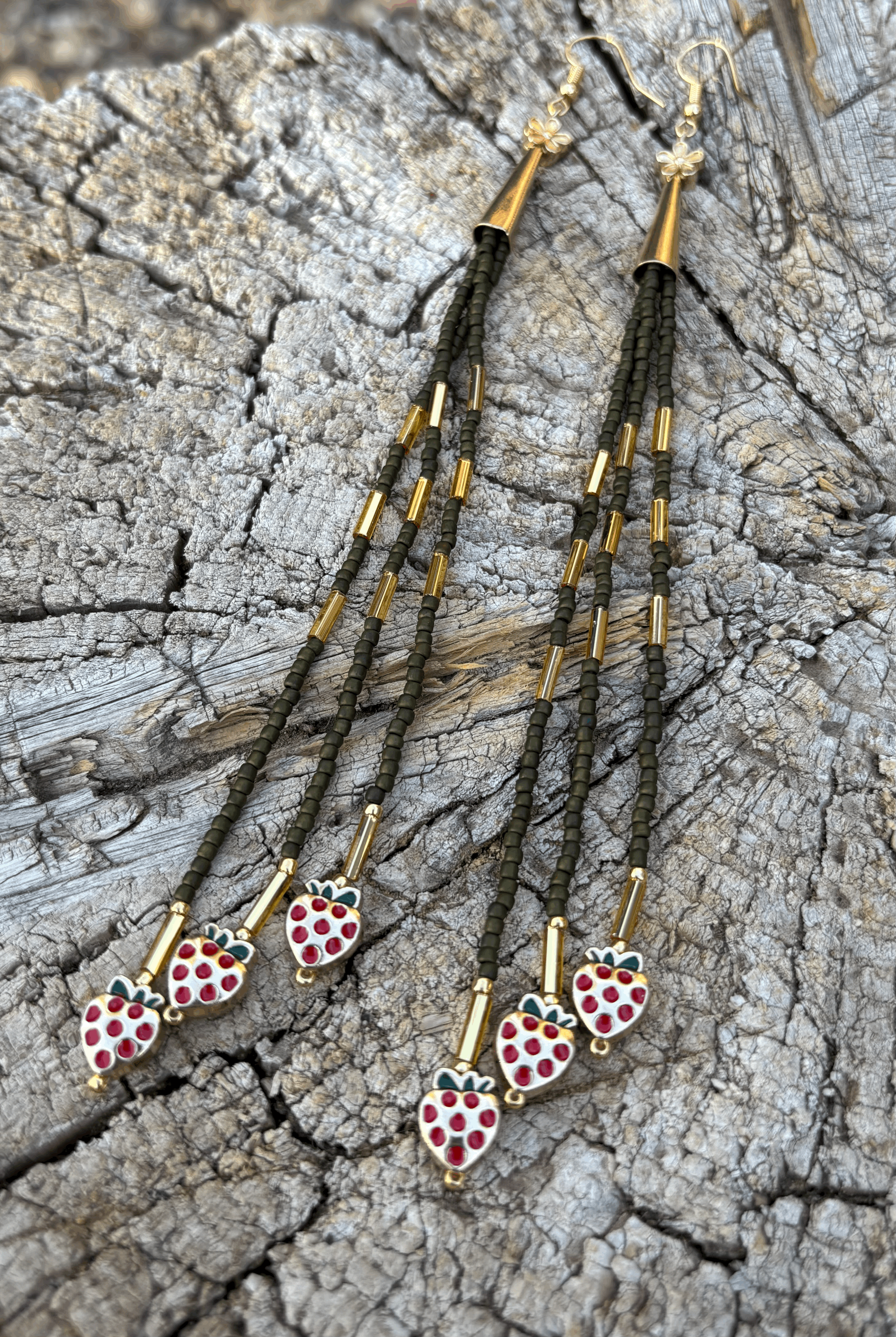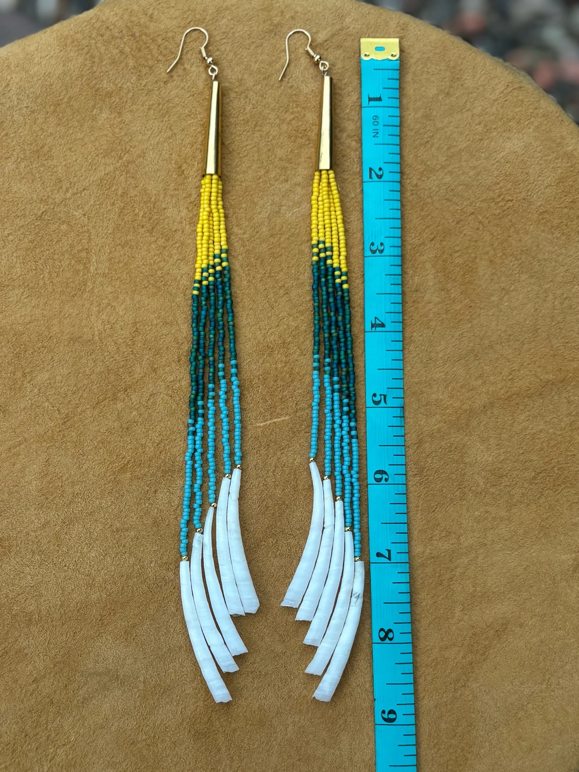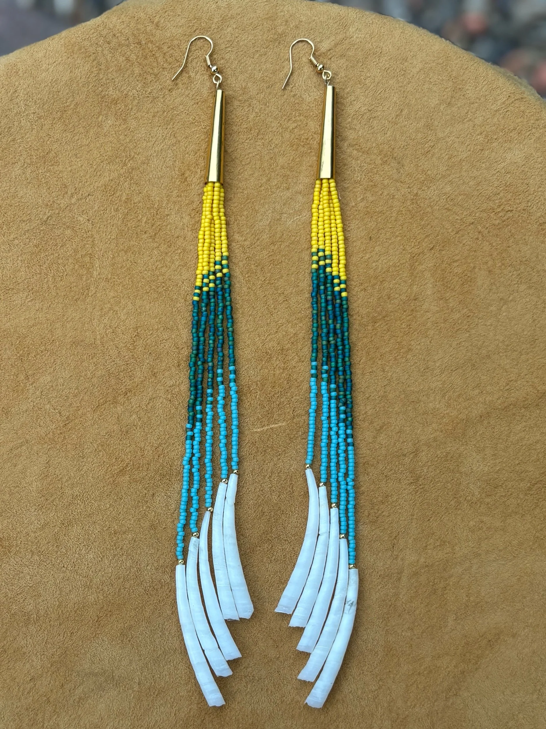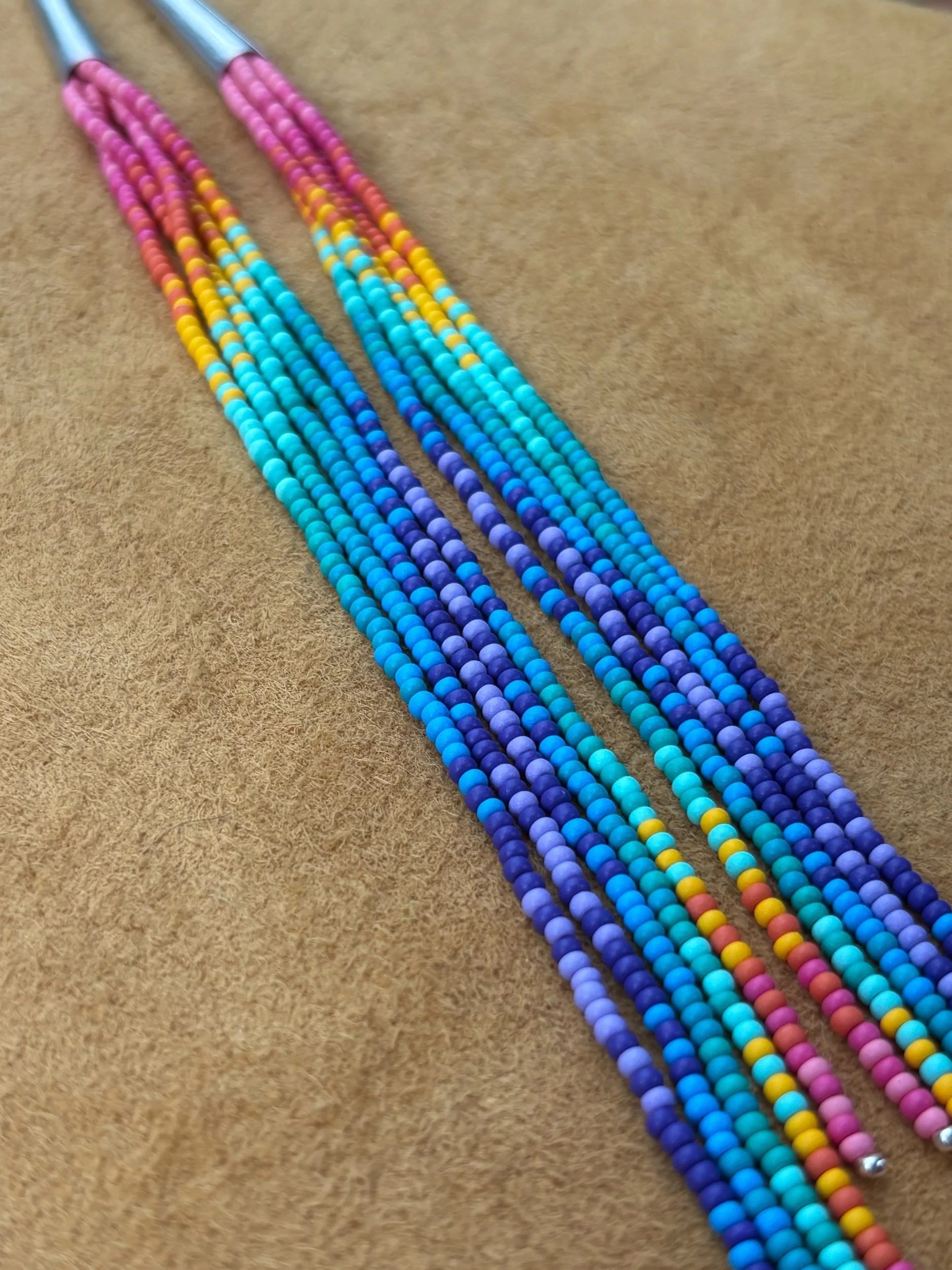 Turquoise and Sterling Silver Seven Strand Fringe Earrings $80.00 Orange and Blue “Thunder Theme Wristlet and Earring Set $70.00 Multicolored Striped Keychain $40.00 Four Strand Rainbow Matte Earrings $120.00 Matte Rainbow Cascading Fringe Earrings $120.00 Blue, Green and Yellow Five Strand Dentalium Fringe Earrings $120.00 Matte Chalk Block Fringe Earrings $80.00 Matte Mustard + Black Fringe Earrings $55.00 Matte Teal and Black + Sterling Silver Fringe Earrings $60.00 Matte Blue and Black + Sterling Silver Fringe Earrings $60.00 Multicolor Fringe Earrings with Sterling Silver Accents $60.00 Sold out Keychain $40.00 Hat Band Sale Price: $50.00 Original Price: $80.00 Sale Green and Gold Strawberry Fringe Earrings Sale Price: $45.00 Original Price: $60.00 Sale Green Dentalium Cascade Earrings $120.00 Sold out GIFT CARD from $50.00