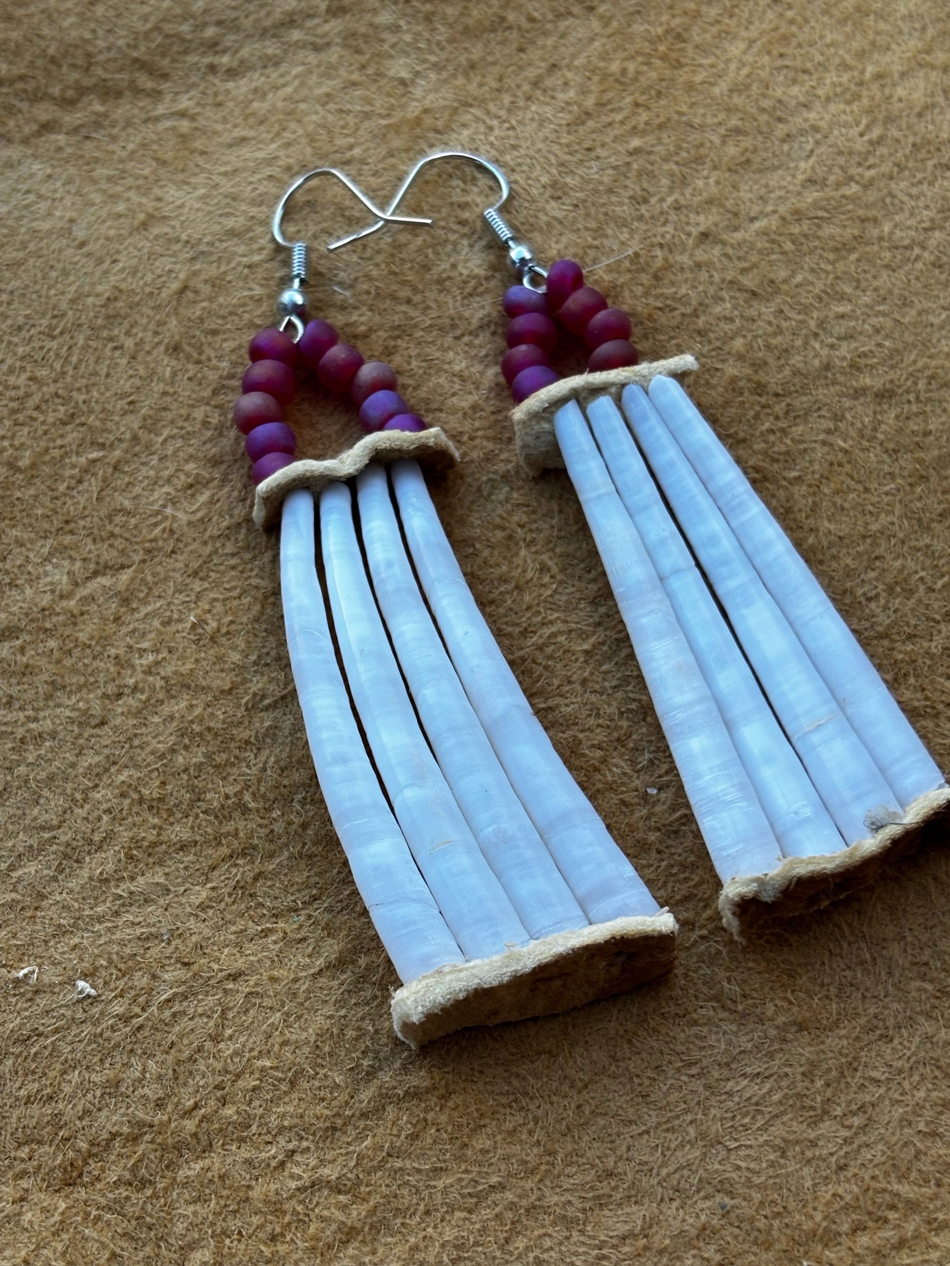 Dentalium earrings with pink iridescent beads