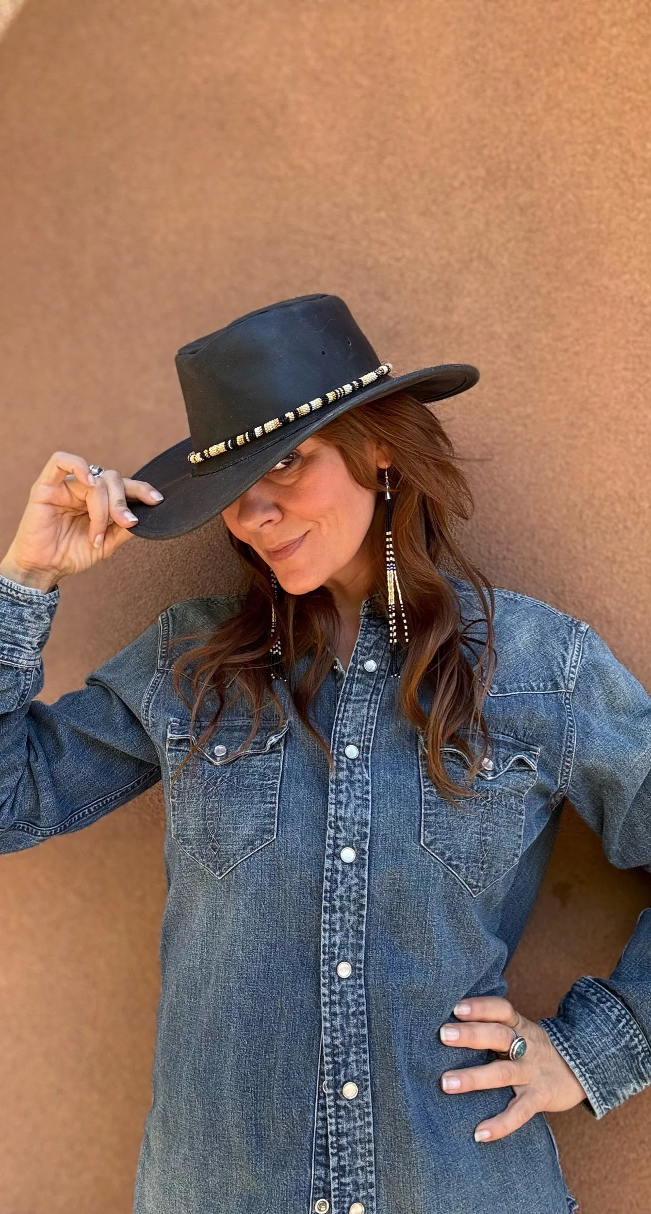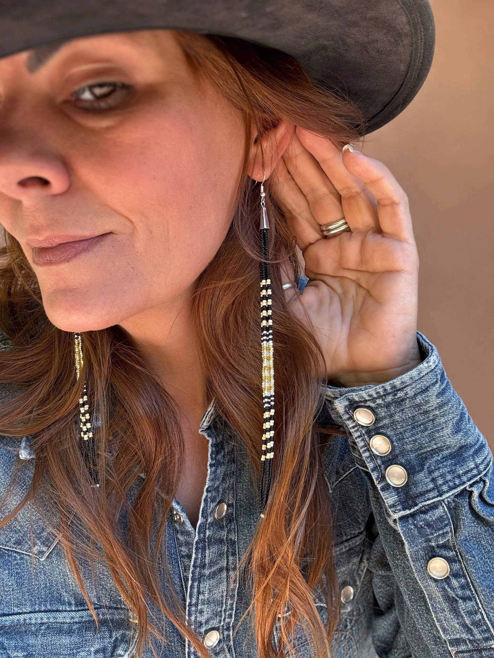 Foldable Minnetonka Leather Hat with Custom Hat Band + Earrings $240.00 Orange and Blue “Thunder Theme Wristlet and Earring Set Sale Price: $50.00 Original Price: $70.00 Sale Multicolored Striped Keychain $40.00 Four Strand Rainbow Matte Earrings Sale Price: $80.00 Original Price: $120.00 Sale Matte Rainbow Cascading Fringe Earrings $120.00 Blue, Green and Yellow Five Strand Dentalium Fringe Earrings Sale Price: $80.00 Original Price: $120.00 Sale Matte Teal and Black + Sterling Silver Fringe Earrings $60.00 Matte Blue and Black + Sterling Silver Fringe Earrings $60.00 Multicolor Fringe Earrings with Sterling Silver Accents $60.00 Sold out Keychain $40.00 Hat Band Sale Price: $50.00 Original Price: $80.00 Sale Green and Gold Strawberry Fringe Earrings Sale Price: $45.00 Original Price: $60.00 Sale Green Dentalium Cascade Earrings $120.00 Sold out GIFT CARD from $50.00