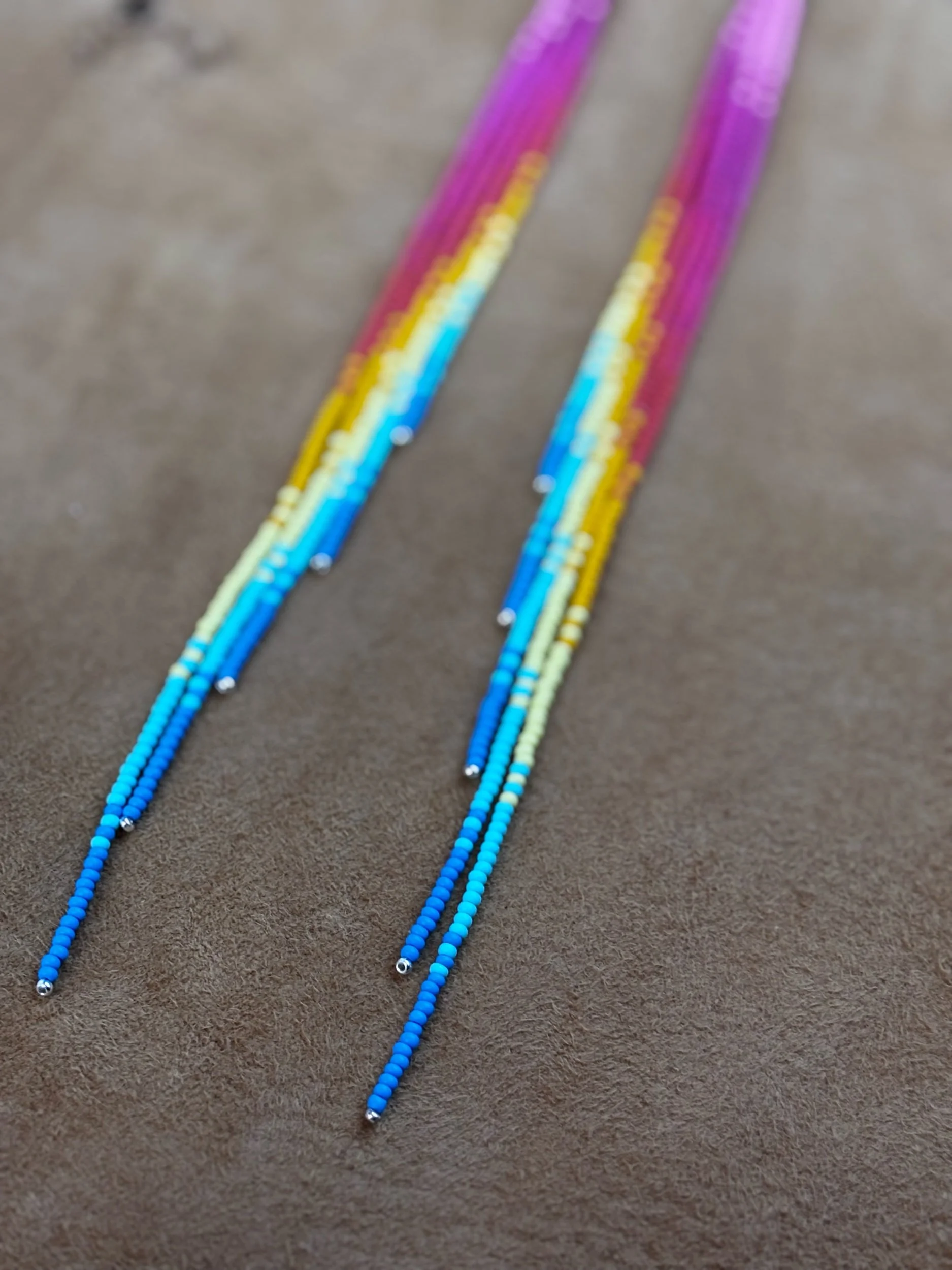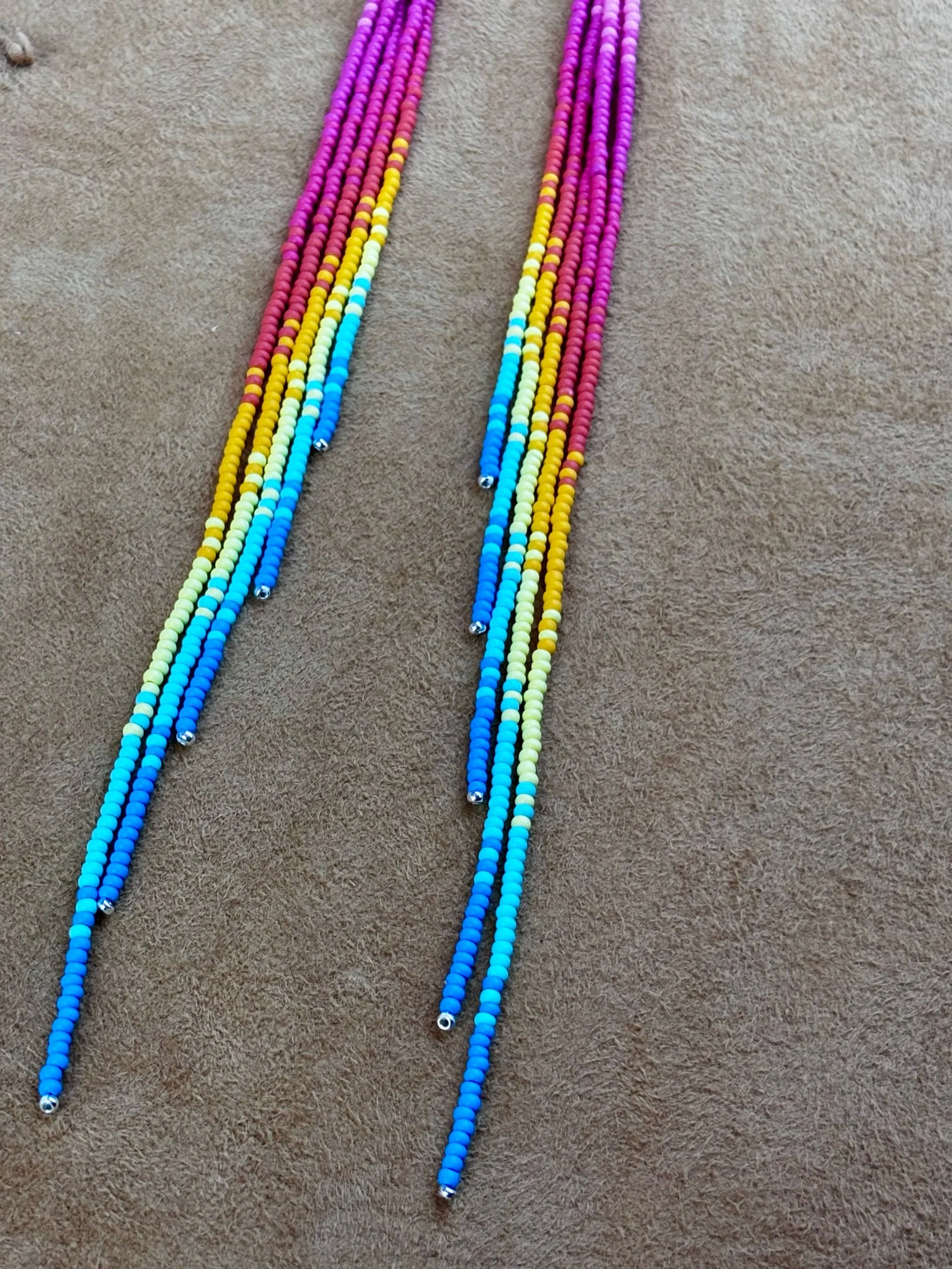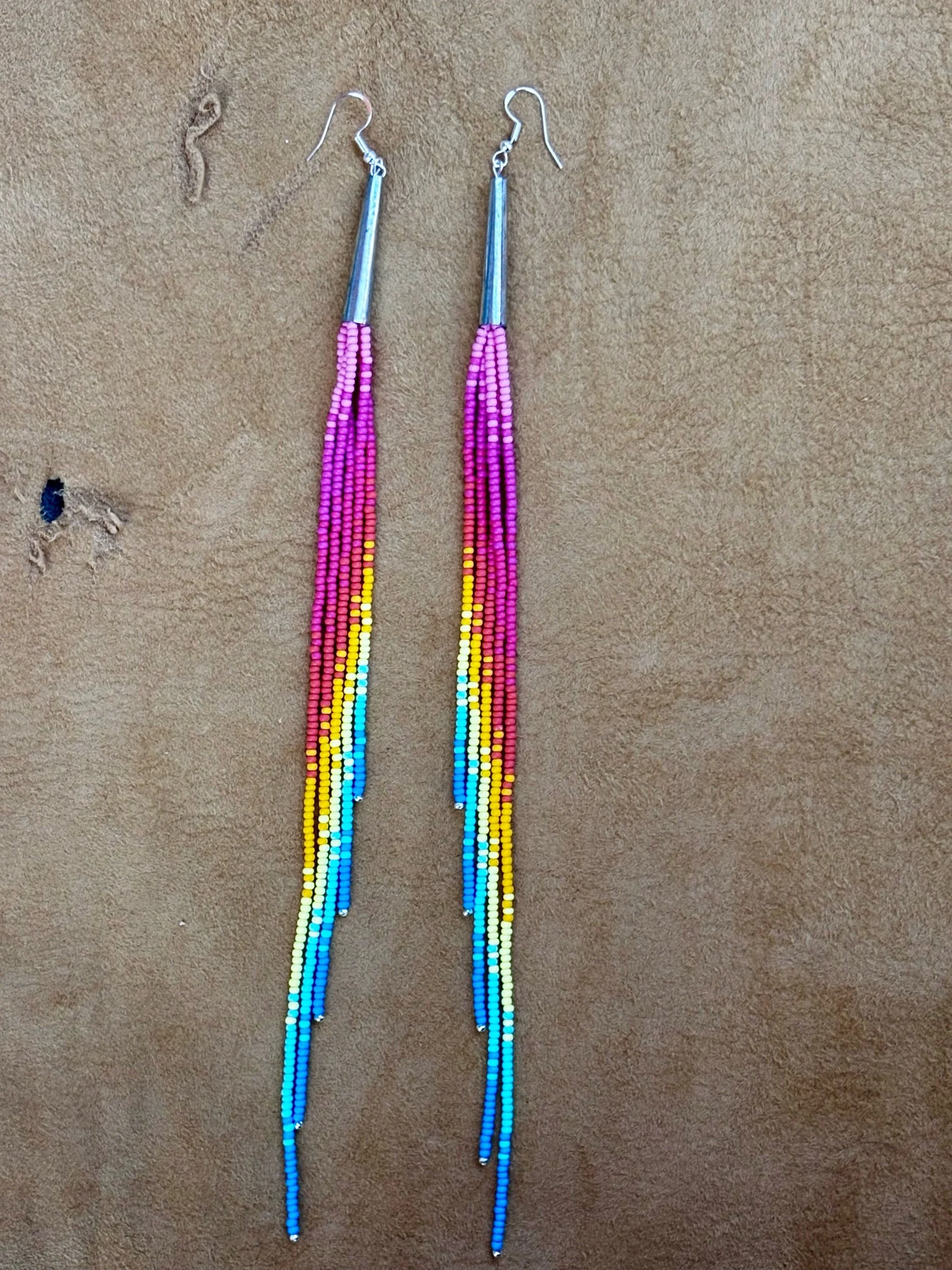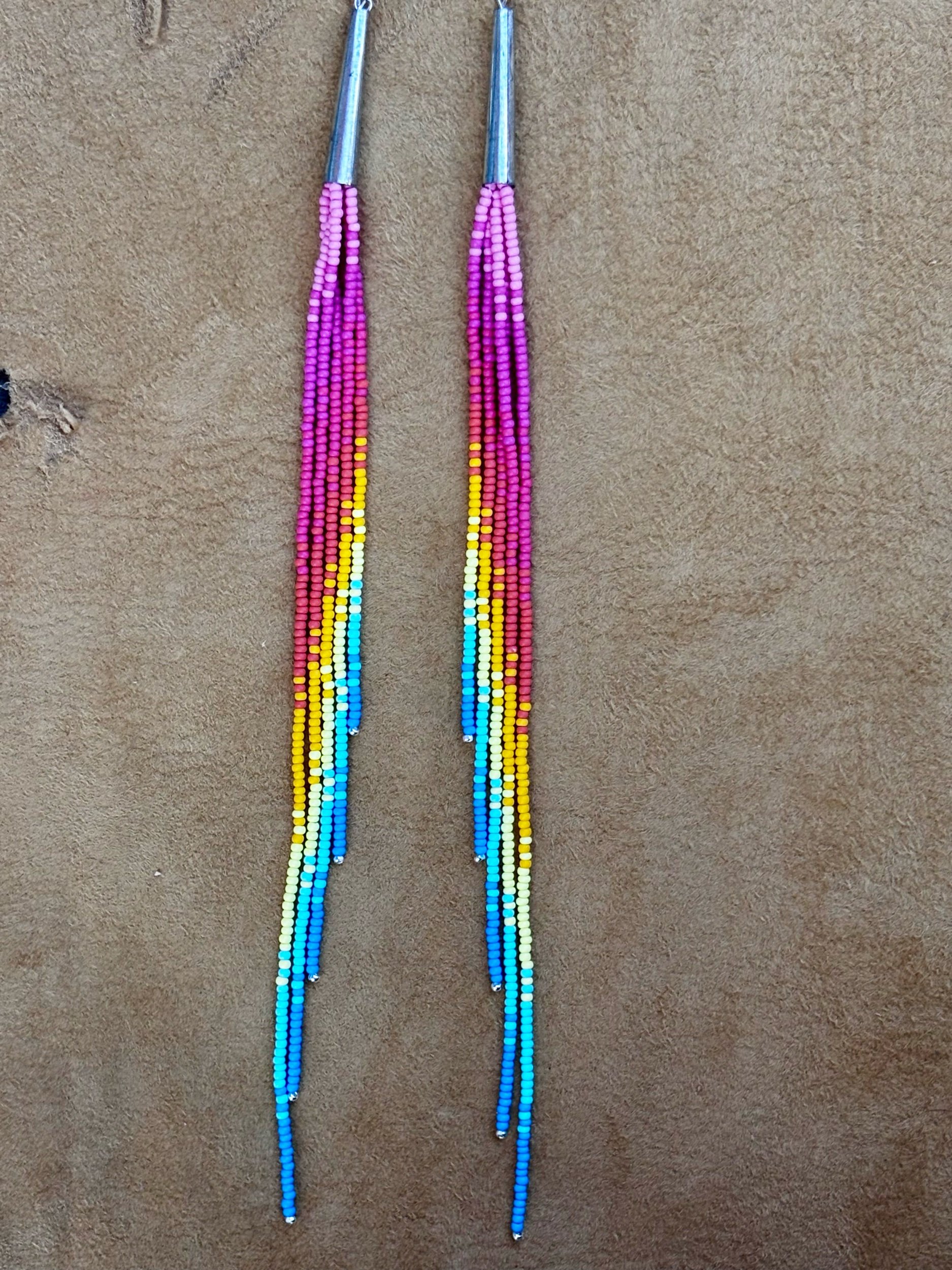 Image 1 of 5 Image 2 of 5 Image 3 of 5 Image 4 of 5 Image 5 of 5 spring sunset themed matte fringe earrings $77.00 spring sunset themed chalk matte fringe earrings with sterling silver accent beads and sterling silver hooks. 9” long Add To Cart Added! spring sunset themed chalk matte fringe earrings with sterling silver accent beads and sterling silver hooks. 9” long