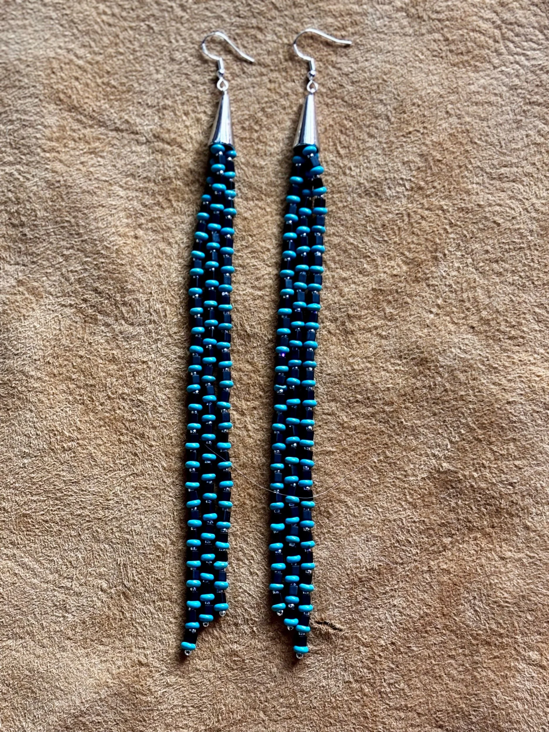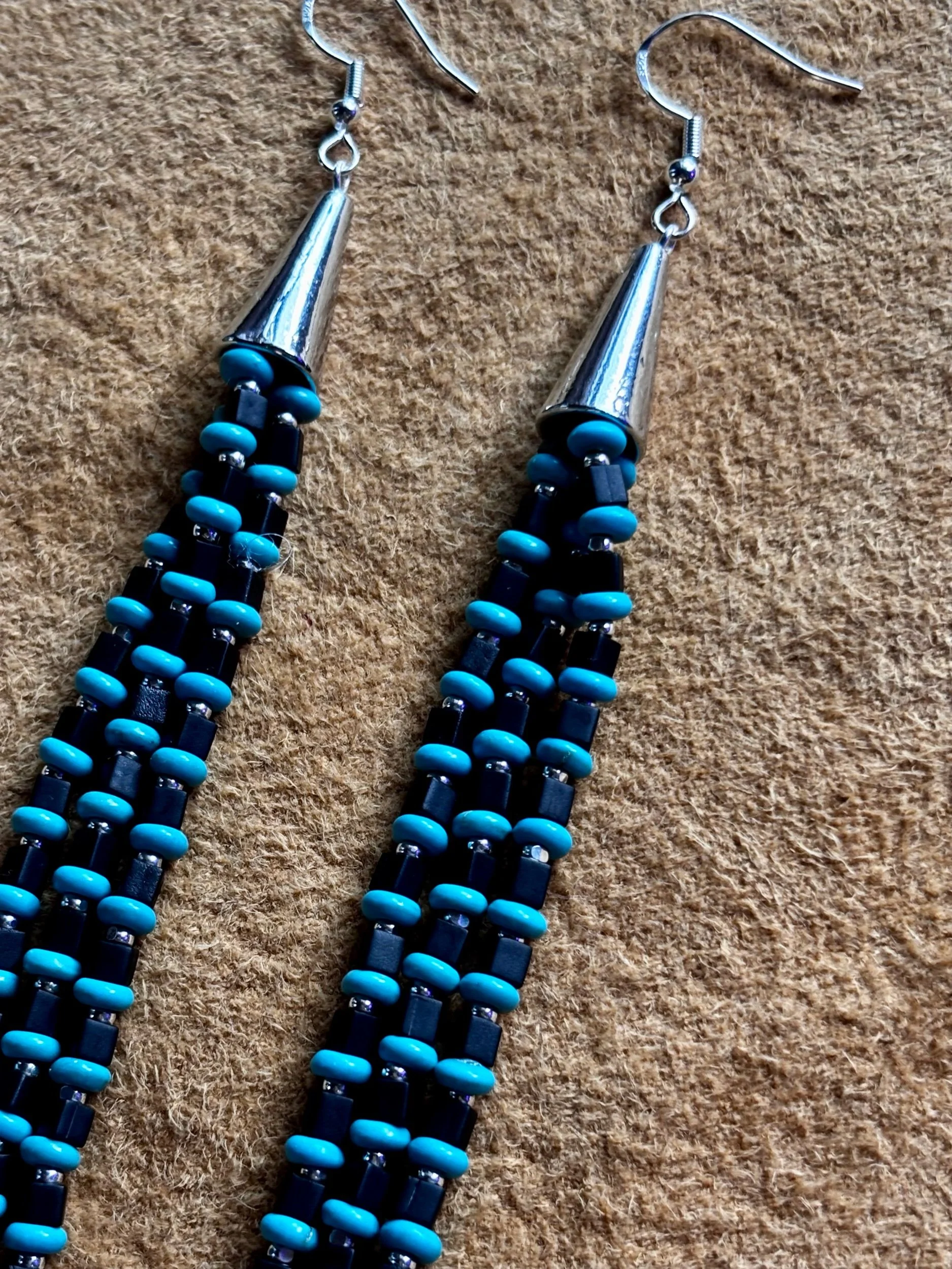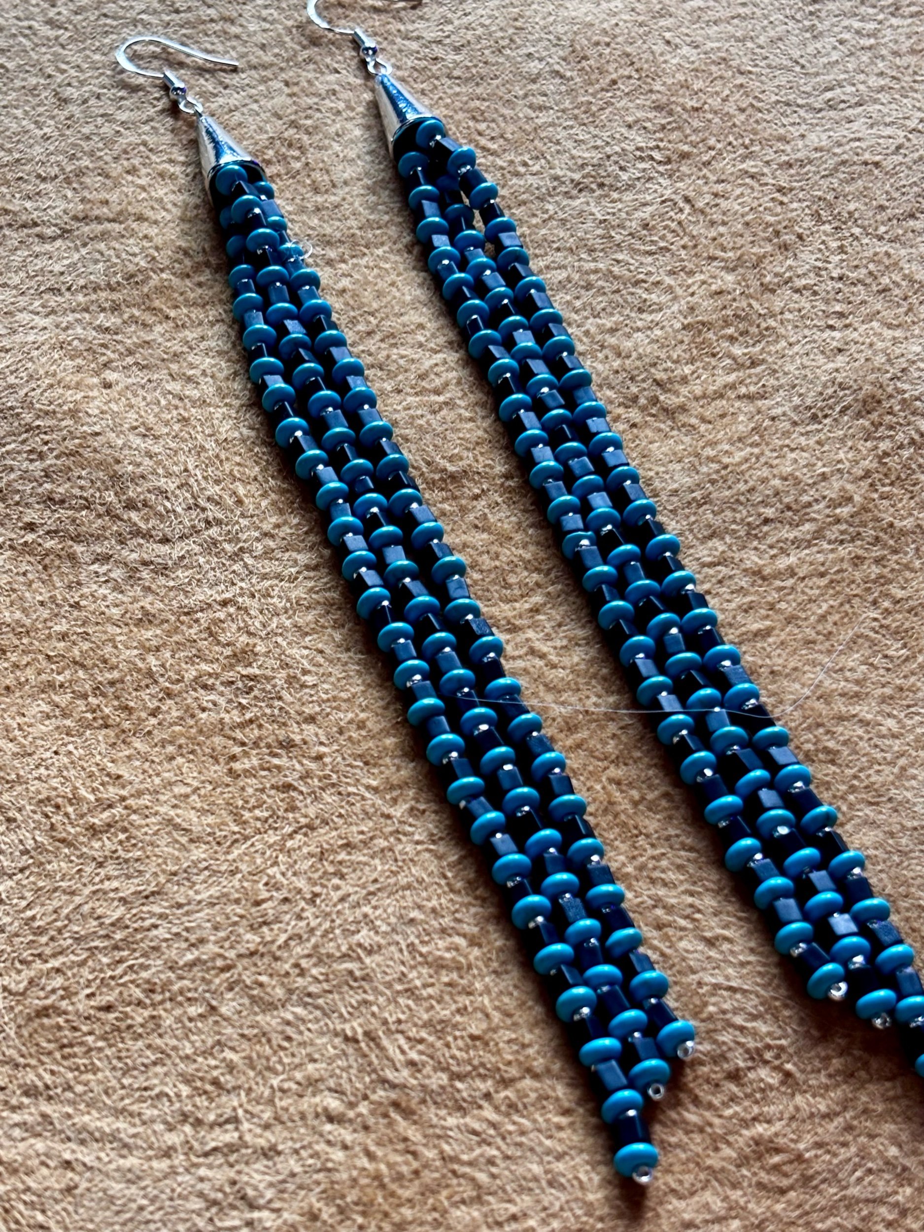 Image 1 of 4 Image 2 of 4 Image 3 of 4 Image 4 of 4 Black square sterling silver fringe earrings $77.00 Fringe earrings made with black square beads + sterling silver + flat round turquoise beads. Sterling silver hooks. 7” long Add To Cart Added! Fringe earrings made with black square beads + sterling silver + flat round turquoise beads. Sterling silver hooks. 7” long